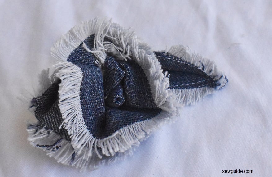 Afterward, you can wash the strips to achieve a further tussled look. As I said, the fraying part is time-consuming. And if the fringes are very long it ‘might’ get knotted if you try fraying it in the washing machine or something. Of course, you can also use a toothbrush or small comb to brush the fringes to straighten them out, but that is even more trouble. Actually a 1/4 inch frayed edge works out the best for these denim flowers.