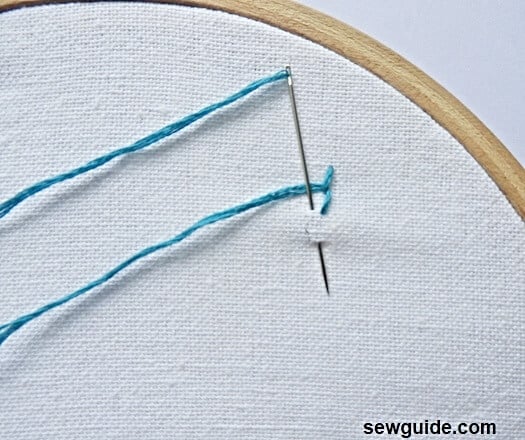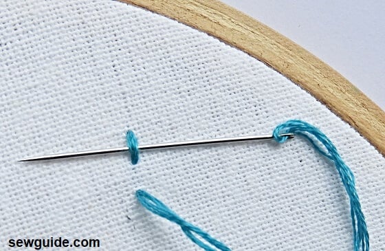 Put the needle back in the same hole it just came through; bring it up a small distance above it. Keep the thread under the needle when bringing up so that a loop is formed.