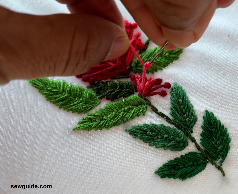 As the name suggests it looks like the pistil of a flower. It is also called LONG TAILED FRENCH KNOT. This stitch is also known as a Long tack knot stitch or Italian knot stitch.