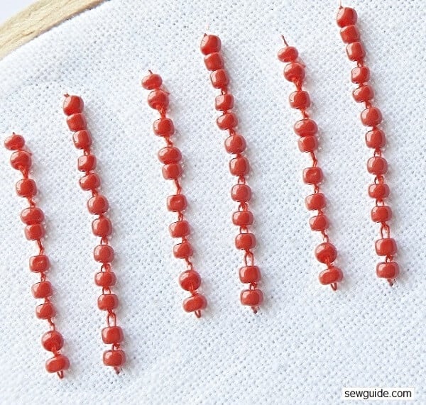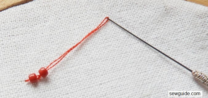 You will be using the needle as you did earlier – inserting the needle from the top and then bringing up the thread by pulling up the needle and then connecting the stitches by inserting the needle through the previous loops. But with beads you will be inserting the beads one by one as you pull up the thread.