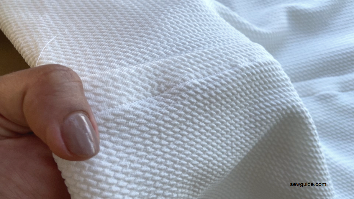 Sew along this pinched area. You should be stitching atleast 1/2 inch from the folded edge. Use the same colored thread as the material of the top.