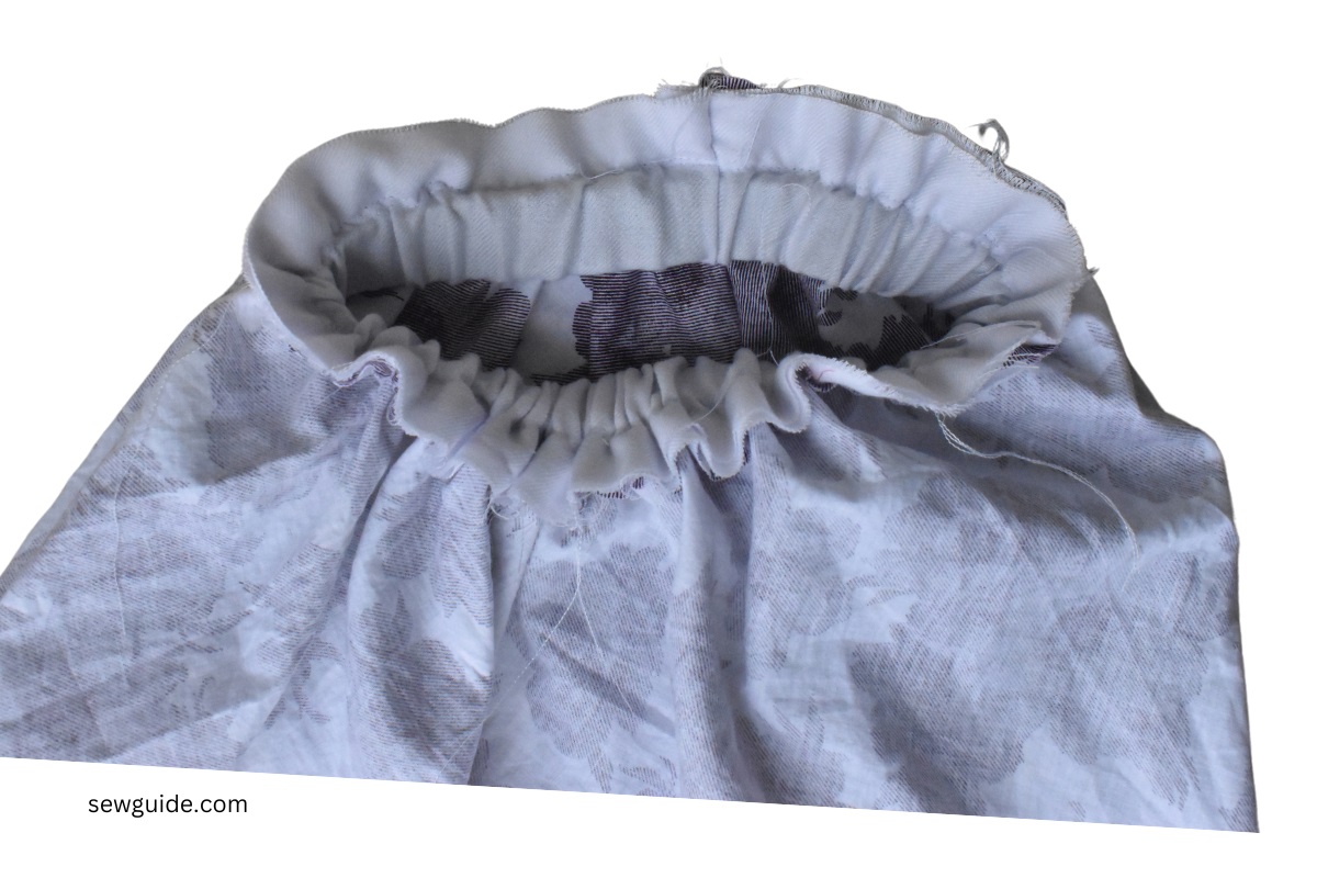 As you sew, the fabric will bunch up – that is ok; just move the elastic to the back so that you can sew easily on smooth fabric, not the bunched-up one. Straighten it after you have sewn it to get a nice gathered waistband.