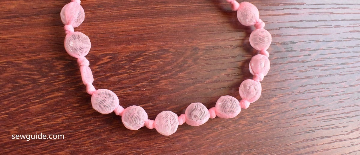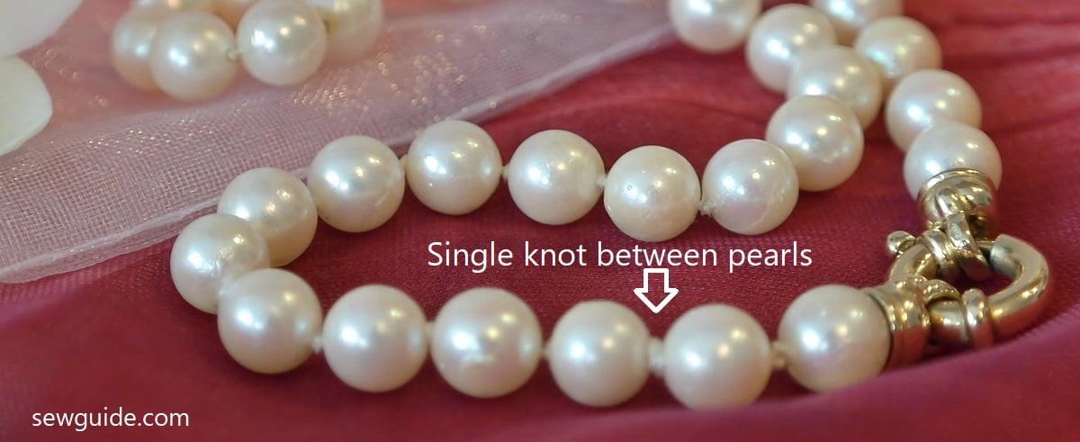 When you have delicate pearls and you want to string it to make a chain for a bag or as jewelry it is better to make a knotted stringing. This involves making small knots between the beads. This will add strength to the chain and also protect the beads from hitting each other and the surface glaze wearing off.