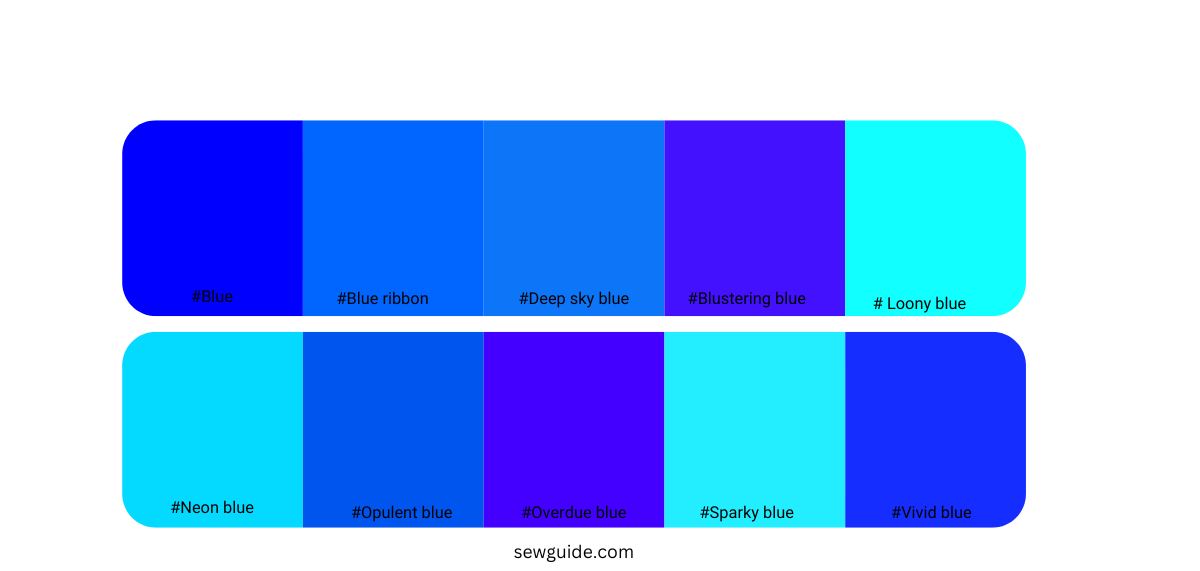 The bright shades of blue are cobalt blue, loony blue, blue ribbon, deep sky blue, blustering blue, Neon blue, opulent blue, Overdue blue, sparky blue, vivid blue.