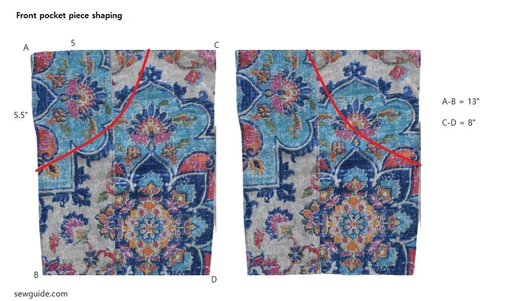 Keep the cut pocket piece face down on the front leg( ensure that the correct popcket piece is chosen – I mean, the right side and left side are different)