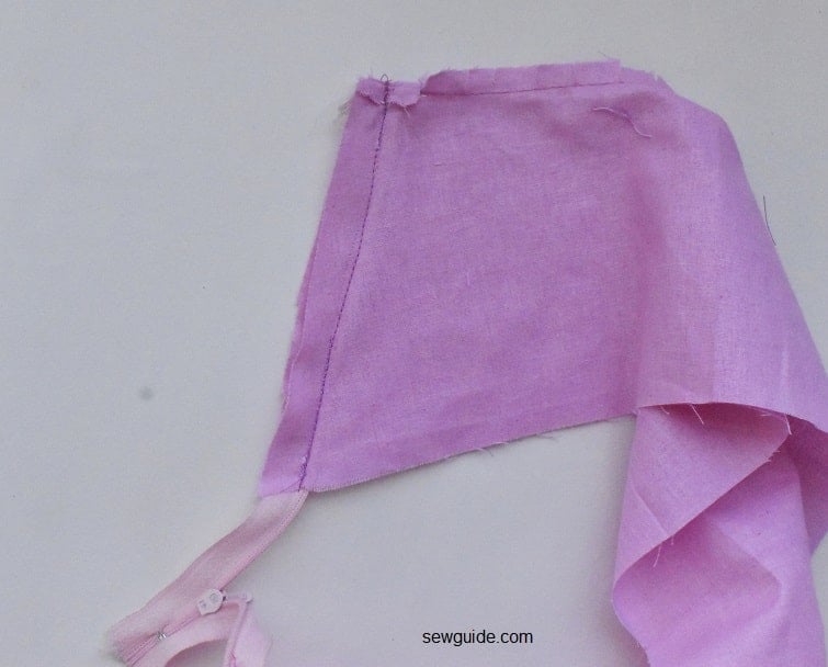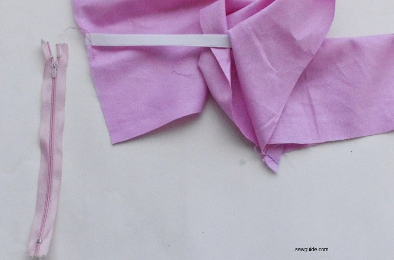 Place the zipper top edge folded as in the picture on the front waistband edge – rightside down.