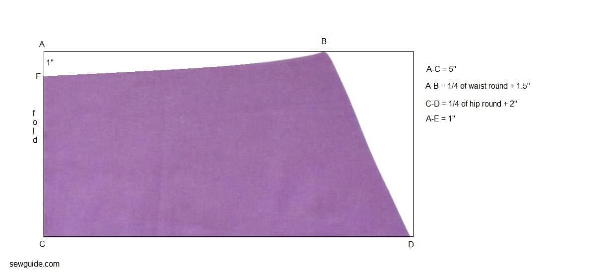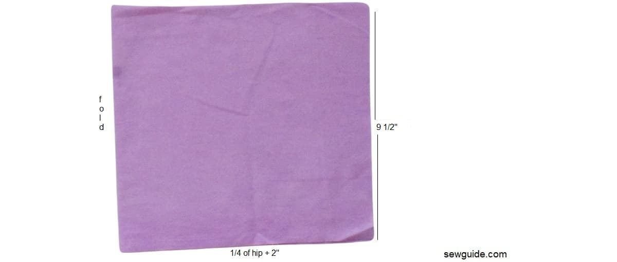 Cut this also on fold. It is just a rectangular fabric piece. Cut it 10 inches long. Width of the waistband = 1/4 of the hip round + 2″