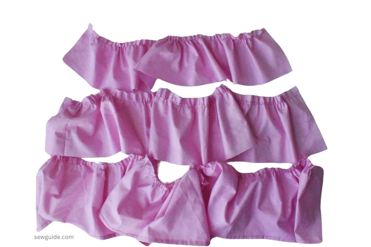 Make gathering stitches to make the frills on the tier fabrics. You can make a single stitch and gather but it would not look as good or gather as nice as it does when you make double rows of long stitches. Just my experience. (Though I have made a single stitch here 🙂 )
