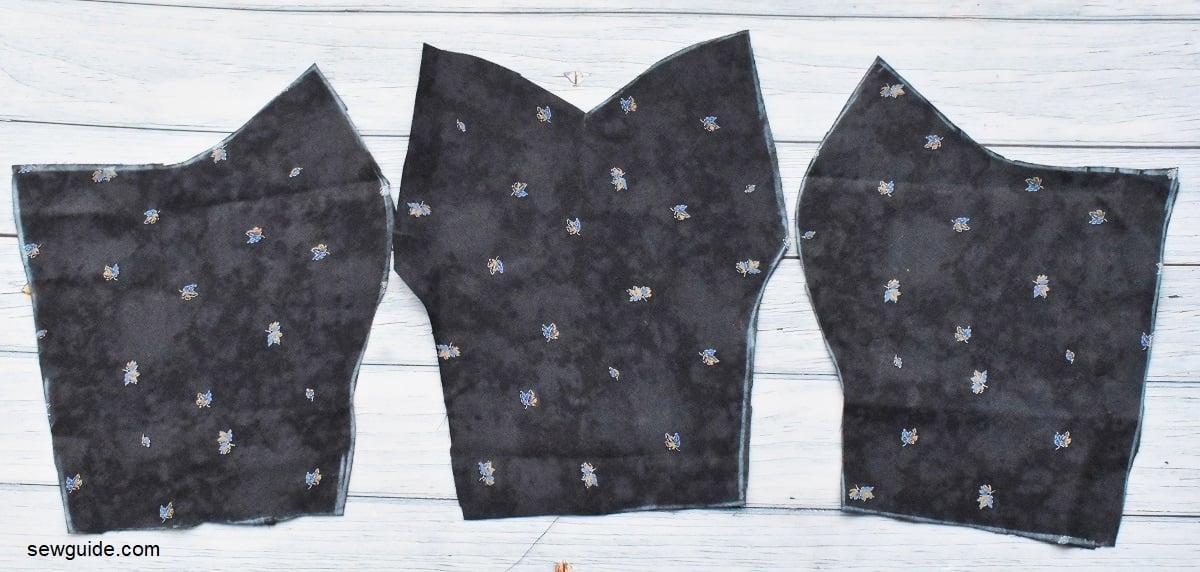 Now , you have to join the outer pieces of front bodice to lining. Keep the outer pieces of front bodice and lining of front bodice together. (right sides to the inside)