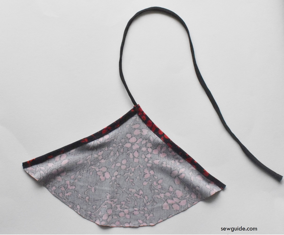 Keep the two triangle shaped fabric pieces together, right sides together. Shape one of the sides to the inside a little and the bottom edge to have a slight curve rather than the angle it has.