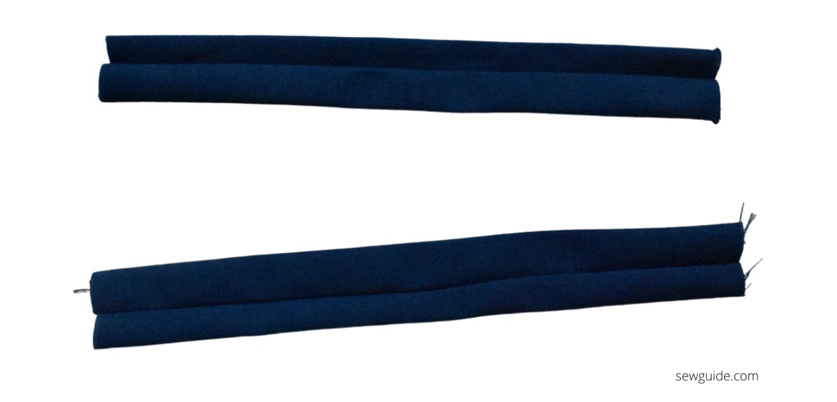 Sew them into tubes by keeping each of them folded by the middle and sewing the edges – turn them right side out.