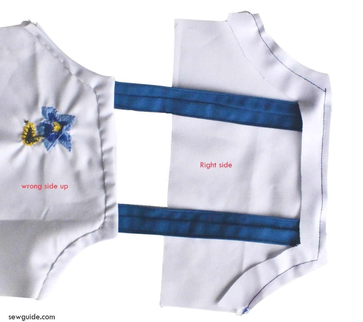 Keep the other end of the straps on top of the back bodice (right side up); keep the facing on top and sew in place. As in the picture above.