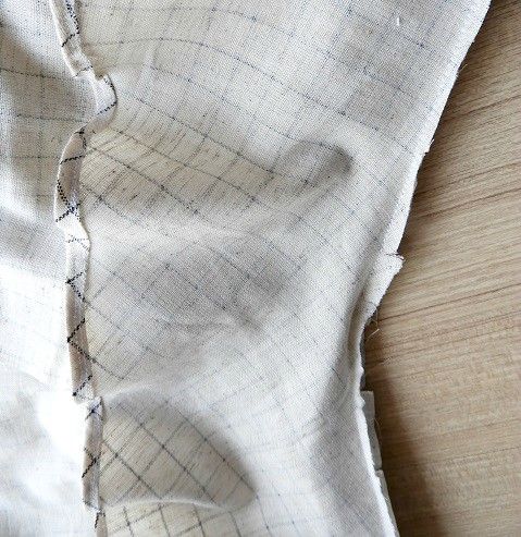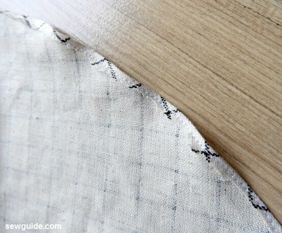 Because the hem is curved you need to create a baby hem – this is a simple turned hem made in two steps. First you trun the edge 1/4 inch and sew very close to the fold . After sewing trim the excess fabric very close to the stitching line as you can see in the picture below