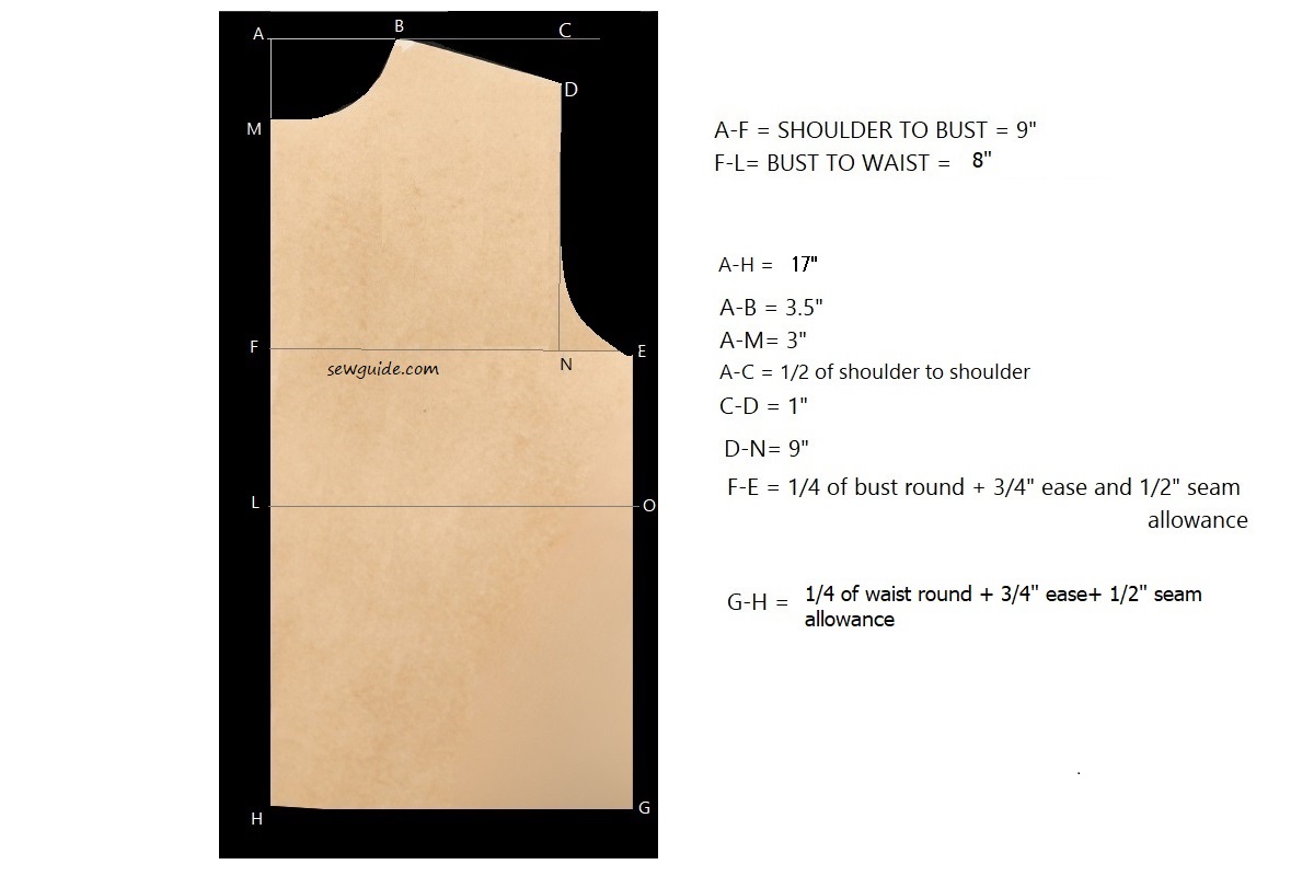 You can draft front and back bodice patterns as per the pattern given here for the basic bodice pattern. Draft it so that the waistline is at the point where you feel it is most flattering for you. The correct position of the waistline is important as a viewer’s eye is naturally drawn to the waistline – so if you want to get eyeballs to your thin natural waistline ensure the peplum waistline is there.