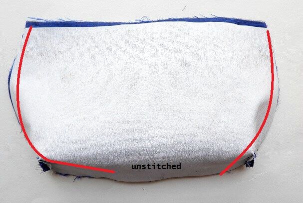 Keep the Lining pieces rightsides together and sew along the edge. (red line indicates stitching line) Leave 2 to 3 inches open at the bottom edge unstitched.